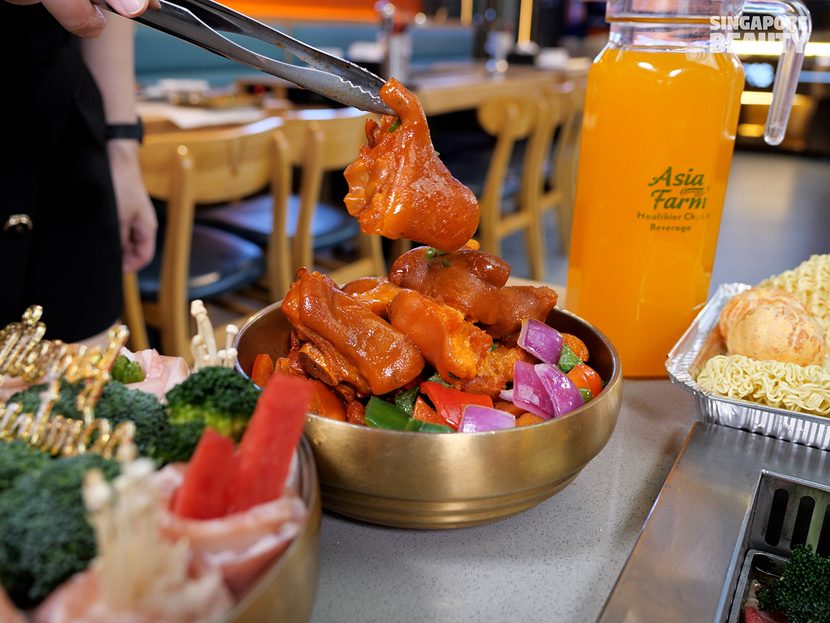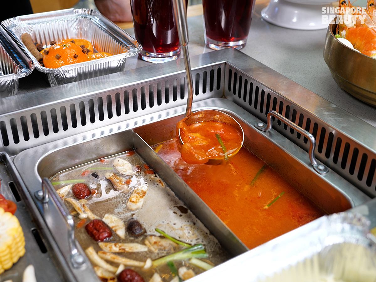 There are 8 savoury soup bases to choose from such as wild mushroom soup, tomato soup, collagen chicken soup, tom yam soup, pork bone soup, Chinese sauerkraut soup, mala spicy soup and laksa soup. We chose the tomato soup and wild mushroom soup for a comforting hotpot experience that is suitable for all ages.